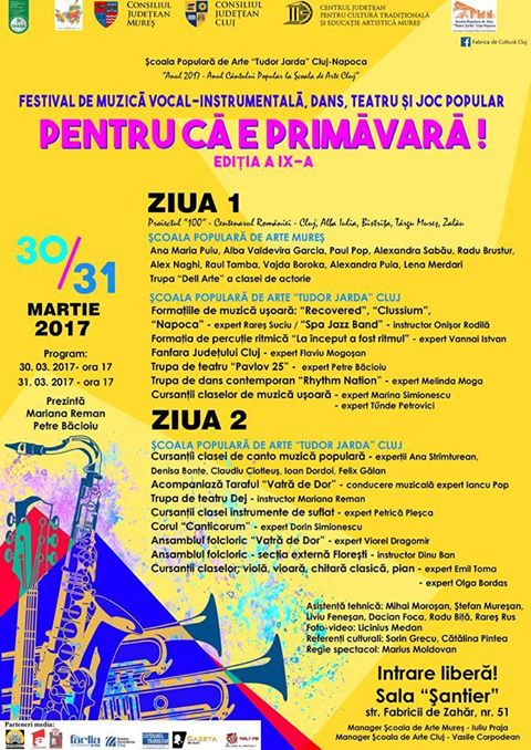 Şcoala Populară de Arte „Tudor Jarda” Cluj, instituţie de cultură care funcționează în subordinea Consiliului Județean Cluj, în colaborare cu Consiliul Judeţean Mureş şi Centrul Judeţean pentru Cultura Tradiţională şi Educaţie Artistică Mureş, organizează în perioada 30-31 martie 2017, cea de-a IX-a ediţie a Festivalului de muzică vocal-instrumentală, dans, teatru şi joc popular „Pentru că e primăvară”. Ambele reprezentaţii vor avea loc în Sala „Şantier” a instituţiei, de pe strada Fabricii de Zahăr nr. 51, începând cu ora 17.00.