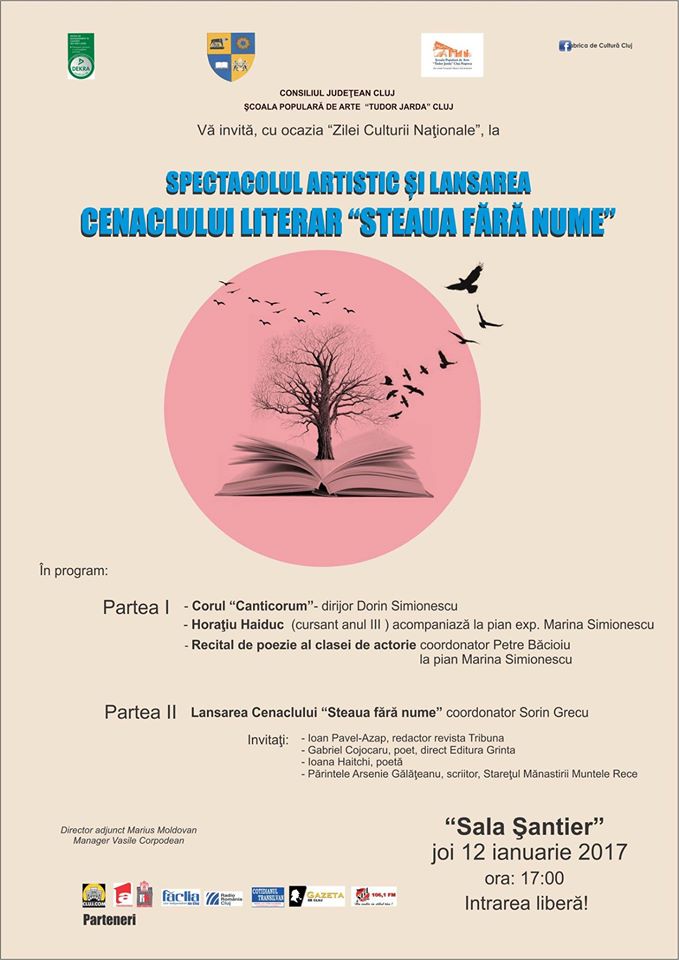 La fel ca în fiecare an, Şcoala Populară de Arte “Tudor Jarda” Cluj, instituţie de cultură aflată sub autoritatea Consiliului Judeţean Cluj, sărbătoreşte joi, 12 ianuarie 2017, ora 17.00, “Ziua Culturii Naţionale”, cu un spectacol artistic şi inaugurarea cenaclului literar “Steaua fără nume”. Celebrarea “Zilei Culturii Naţionale”, zi stabilită de statul român pentru data de 15 ianuarie, ziua naşterii poetului Mihai Eminescu, va avea loc în Sala “Şantier” a școlii, de pe str. Fabricii de Zahăr nr. 51. Manifestările se vor realiza în cadrul “Joii Artelor”, Știri de tradiţie al şcolii, adevărată repetiţie generală pentru spectacolele pe care cursanţii şi experţii Şcolii de Arte le susţin în diverse ocazii. Astfel, prima parte a manifestării, prezentată de actorul Petre Băcioiu, va conţine un program artistic susţinut de Corala “Canticorum” a şcolii – dirijor Dorin Mircea Simionescu şi un moment poetic susţinut de un grup de cursanţi din anul I al clasei de actorie – coordonator expert Petre Băcioiu, acompaniaţi la pian de doamna expert Maria Marina Simionescu. În partea a doua va avea loc inaugurarea cenaclului literar al Şcolii de Arte Cluj, “Steaua fără nume”, o nouă modalitate a instituţiei mai sus amintite de a descoperi valori şi talente artistice, proiect coordonat de referentul cultural, poetul şi jurnalistul Sorin Grecu. Printre invitaţii şedinţei inaugurale de cenaclu, care va conţine recitaluri de poezie şi muzică folk, se numără scriitori consacraţi dar şi iubitori de poezie, dintre care îi amintim pe Ioan Pavel-Azap – redactor revista Tribuna, Gabriel Cojocaru – poet, directorul editurii Grinta, Ioana Haitchi – poetă, părintele Arsenie Gălăţean – scriitor, stareţul Mănăstirii Muntele Rece şi mulţi alţii. De ce acest titlu pentru un cenaclu literar? Pentru că, în spiritul “Poetului nepereche”, Steaua fără nume întruchipează tocmai idealul celui sărbătorit, acela de a scruta cu ochii larg deschişi viitorul şi descoperirea inefabilului poetic – dar şi vital – al “stelei” ce-a răsărit, în cazul nostru al descoperirii unor noi valori ale literaturii române.