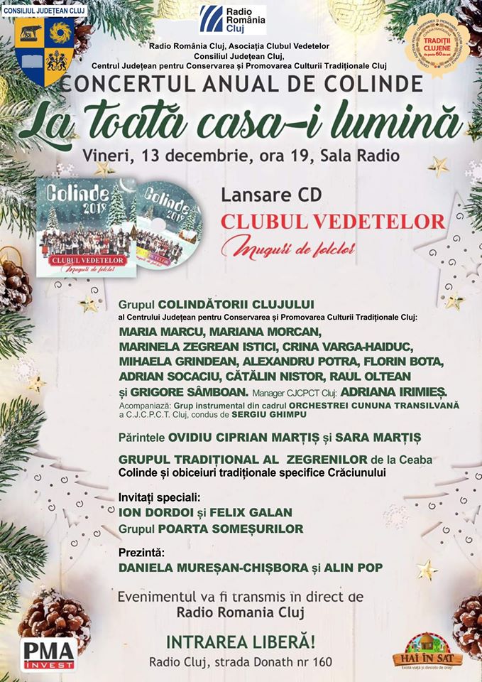 Grupul „Corindătorii Clujului” al Centrului Județean pentru Conservarea și Promovarea Culturii Tradiționale Cluj, instituție de cultură aflată sub autoritatea Consiliului Județean Cluj, va participa vineri, 13 decembrie 2019, de la ora 19.00, în Sala de spectacole a Studioului de Radio Cluj, la Concertul anual de colinde „La toată casă-i lumină”.