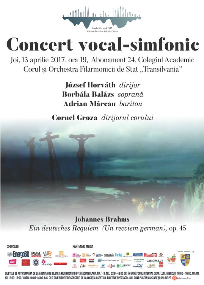 Filarmonica de Stat „Transilvania”, instituţie de cultură care funcţionează sub autoritatea Consiliului Judeţean Cluj, invită publicul interesat joi, 13 aprilie, începând cu ora 19.00, la Concertul vocal-simfonic dedicat sărbătorilor de Paşte, dirijat de József Horváth. Sub bagheta lui, Corul şi Orchestra Filarmonicii „Transilvania”, alături de soliştii Borbála Balázs şi Adrian Mărcan, vor interpreta „Un recviem german” de Brahms. Dirijorul corului este Cornel Groza.