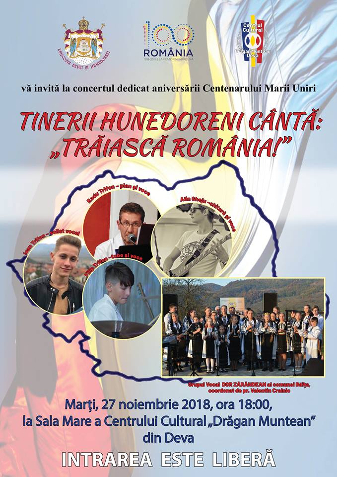 Centrul Cultural „Drăgan Muntean” Deva şi Episcopia Devei şi Hunedoarei vă invită, marţi, 27 noiembrie 2018, la ora 18:00, în sala mare a Centrului Cultural „Drăgan Muntean”, la concertul „Tinerii hunedoreni cântă: Trăiască România!”, dedicat aniversării Centenarului Marii Uniri.