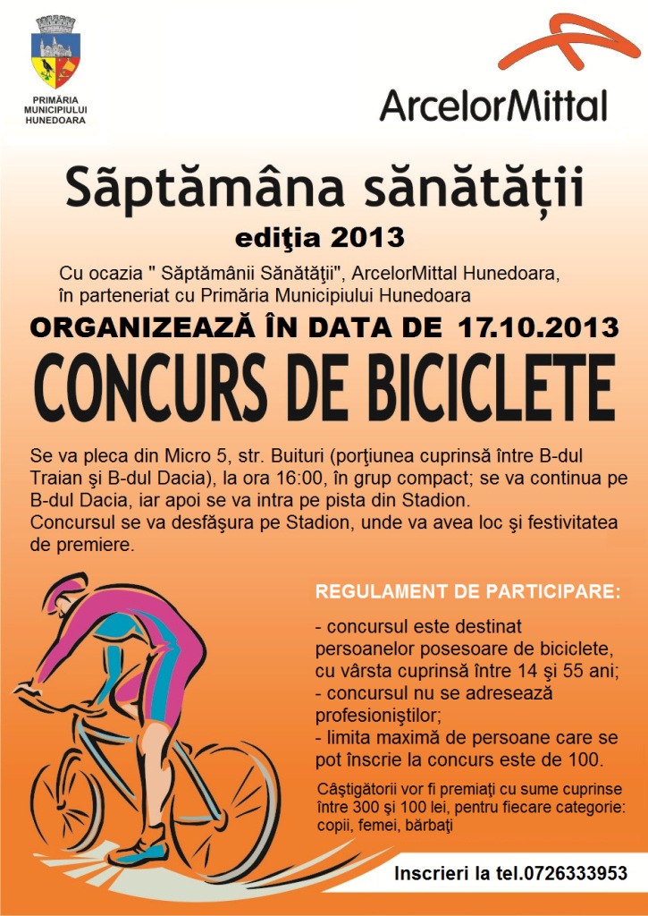 Cu ocazia „Săptămânii Sănătăţii”, ArcelorMittal Hunedoara în parteneriat cu Primăria Municipiului Hunedoara organizează un concurs de biciclete ce va avea loc joi, 17 octombrie 2013.