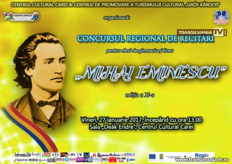 Direcția de Cultură Carei, Centrul Cultural al Municipiului Carei în colaborare cu Centrul de Promovare a Turismului Cultural „Gróf Károlyi” organizează cea de-a unsprezecea ediție a concursului regional de recitări „Mihai Eminescu” vineri, 27 ianuarie 2017, la Centrul Cultural Carei, în Sala „Deák Endre”, conform următorului program: