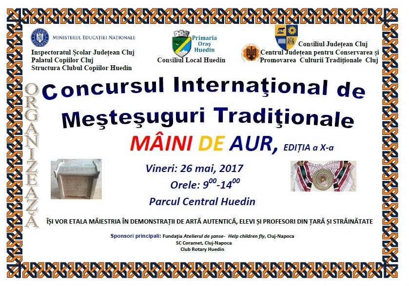 Centrul Judeţean pentru Conservarea şi Promovarea Culturii Tradiţionale Cluj, instituţie de cultură care funcţionează în subordinea Consiliului Judeţean Cluj, Clubul Copiilor Huedin, Inspectoratul Şcolar Judeţean Cluj, Primăria şi Consiliul Local Huedin organizează cea de-a X-a ediţie a Concursului Internaţional de Meşteşuguri Tradiţionale „Mâini de Aur”. Știriul, la care vor participa peste 100 de elevi din ţară şi din străinătate, însoţiţi de profesorii coordonatori, se va desfăşura în perioada 25 – 27 mai 2017.