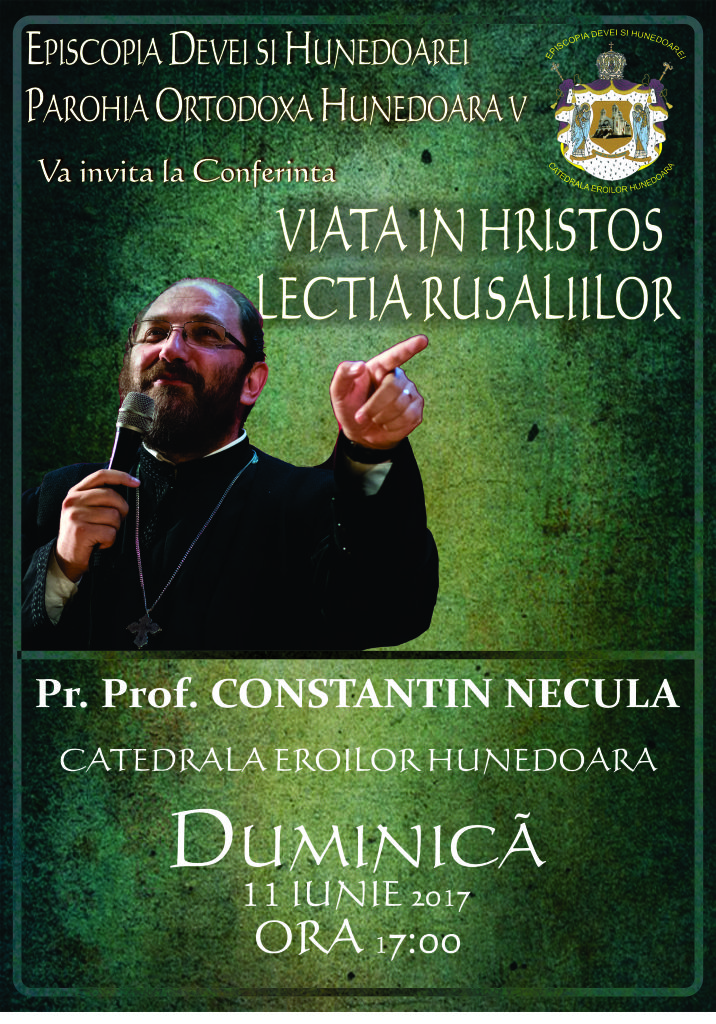 Cu binecuvântarea Preasfințitului Părinte Gurie, Episcopul Devei și al Hunedoarei, duminică, 11 iunie 2017, la ora 17:00, va avea loc în Catedrala Eroilor din Hunedoara o conferință teologică susținută de Părintele profesor dr. Constantin Necula de la Facultatea de Teologie „Sfântul Andrei Șaguna” din Sibiu. Conferința este prilejuită de sărbătorirea hramului Catedralei hunedorene, Duminica Tuturor Sfinților.