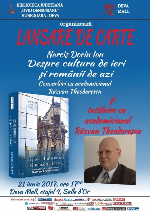 Biblioteca Județeană „Ovid Densusianu” Hunedoara-Deva, în parteneriat cu Editura RAO din București, organizează în ziua de 21 iunie 2017, ora 17.00, în incinta Deva Mall, etajul patru, Salle d’Or, un eveniment cultural de înaltă ținută: lansarea cărții „Despre cultura de ieri și românii de azi. Convorbiri cu academicianul Răzvan Theodorescu”, autor Narcis Dorin Ion, apărută la Editura RAO. Prefața cărții este semnată de acad. Virgil Cândea, iar postfața îi aparține istoricului Alex Mihai Stoenescu. La eveniment vor fi prezenți academicianul Răzvan Theodorescu, Narcis Dorin Ion și directorul Editurii RAO, Ovidiu Enculescu.