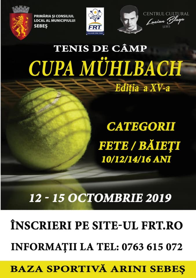 Municipiul Sebeș este, și în acest an, gazda primitoare a competiției “Cupa Muhlbach” la tenis de câmp, rezervată copiilor și juniorilor, la categoriile de vârstă 8, 10, 12, 14, 16 ani, băieți și fete.Întrecerile se desfășoară pe terenurile bazei sportive “Arini” Sebeș, în zilele de 12-15 octombrie 2019.În baza cererii de licență, competiția de categoria întâi este cuprinsă în calendarul competițional pe anul 2019 întocmit de Federația Română de Tenis.Vor participa sportivi legitimați din toată țara, iar rezultatele obținute contează pentru întocmirea clasamentului general individual pe categorii de vârstă.Înscrierile se fac pe site-ul Federației Române de Tenis, iar arbitrul principal desemnat de aceasta va efectua tabloul de concurs conform regulamentului.Primăria și Consiliul Local al Municipiului Sebeș, Centrul Cultural “Lucian Blaga”, parteneri în organizarea acestui eveniment sportiv, vor acorda diplome, cupe, medalii și obiecte sportive.Pentru informații, vă rugăm să apelați numărul de telefon: 0763-615 072.