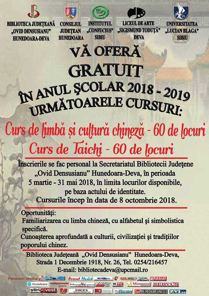 Biblioteca Județeană „Ovid Densusianu” Hunedoara-Deva anunță, pe această cale, organizarea în continuare a cursurilor gratuite de limbă și cultură chineză și a cursurilor de Taichi și în anul școlar 2018-2019.