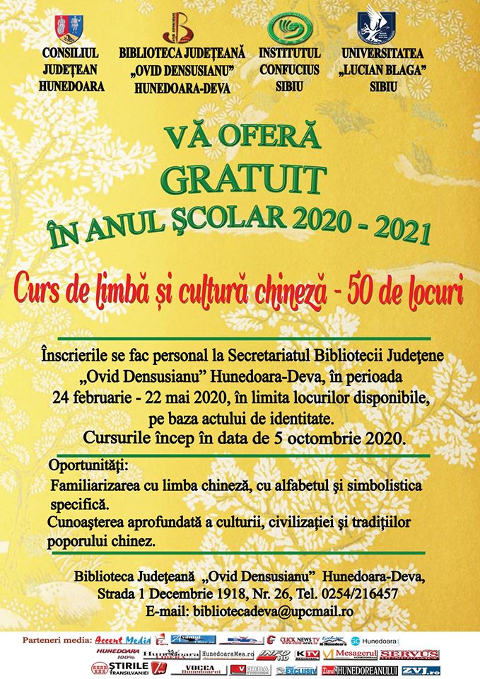 Biblioteca Județeană „Ovid Densusianu” Hunedoara-Deva anunță, pe această cale, organizarea în continuare a cursurilor gratuite de limbă și cultură chineză și în anul școlar 2020-2021.