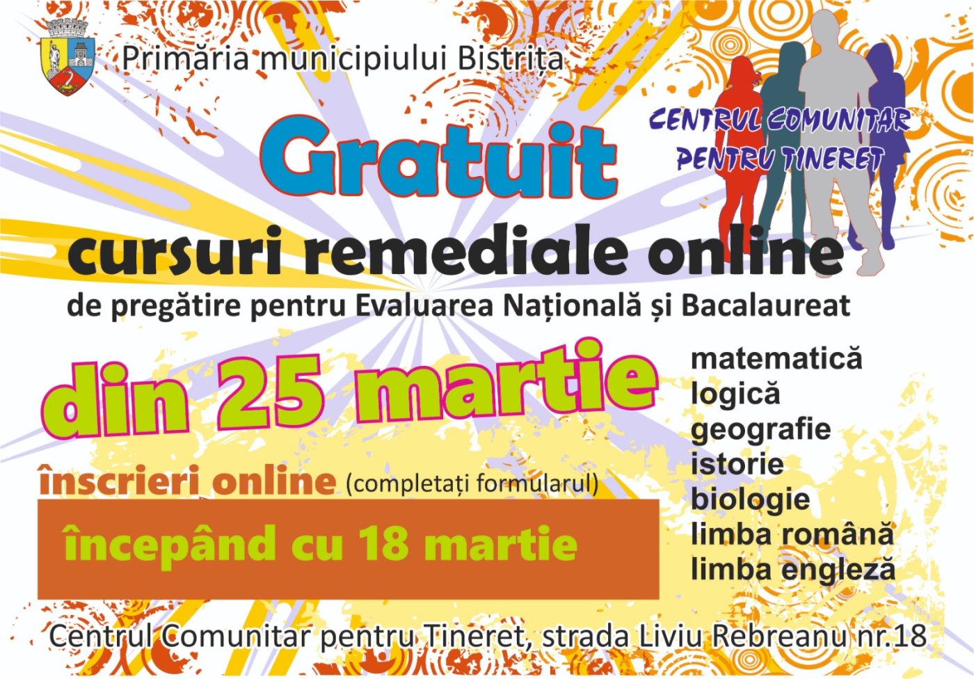 Primăria municipiului Bistriţa, în colaborare cu Inspectoratul Școlar Județean Bistrița-Năsăud, organizează, prin Centrul Comunitar pentru Tineret cursuri remediale online, începând cu data de 25 martie 2024. Cursurile de pregătire pentru Evaluarea Naţională şi Bacaluareat la diferite discipline (matematică, logică, geografie, istorie, biologie, limba română şi limba engleză) sunt susținute de profesori voluntari.