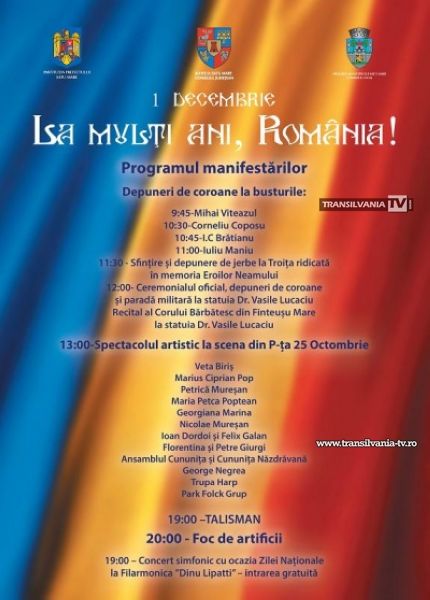 Prefectura Satu Mare, Consiliu Județean Satu Mare și Primăria Satu Mare organizează diverse manifestări pentru sătmăreni cu ocazia Zilei Naționale a României.