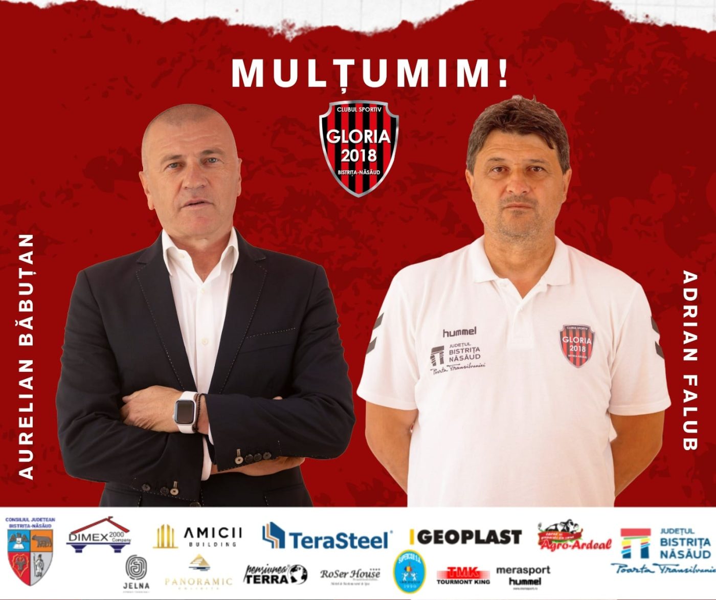 Colaborarea dintre antrenorul principal Adrian Falub, directorul sportiv Aurelian Babuțan respectiv conducerea Clubul Sportiv Gloria 2018 Bistrița-Năsăud, încheiată în 1 iulie 2024 – nu a mai fost prelungită, din cauza neîndeplinirii obiectivului de promovare în Liga a 2-a.