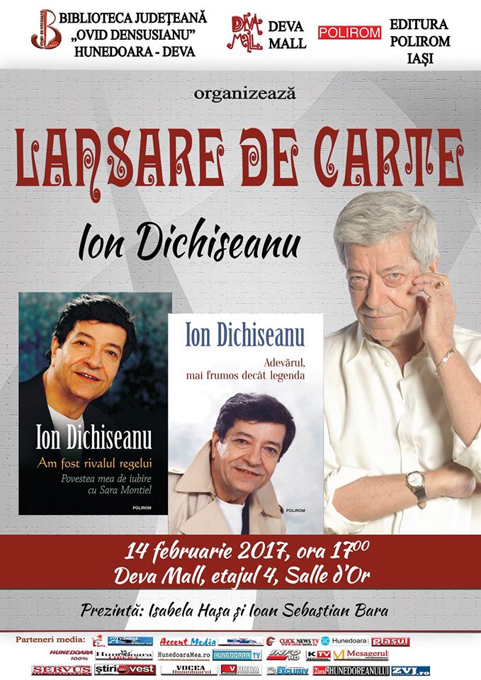 Biblioteca Județeană „Ovid Densusianu” Hunedoara-Deva în parteneriat cu Editura Polirom din Iași, organizează în ziua de 14 februarie 2017, ora 17.00, în incinta Deva Mall, etajul patru, Salle d’Or, un eveniment cultural cu totul special: întâlnirea cu îndrăgitul actor de teatru și film Ion Dichiseanu, care își va lansa volumele „Am fost rivalul regelui. Povestea mea de iubire cu Sara Montiel” și „Adevărul, mai frumos decât legenda”, ambele apărute la Editura Polirom. Al doilea volum va fi lansat în premieră la Deva, ceea ce ne onorează în mod deosebit.