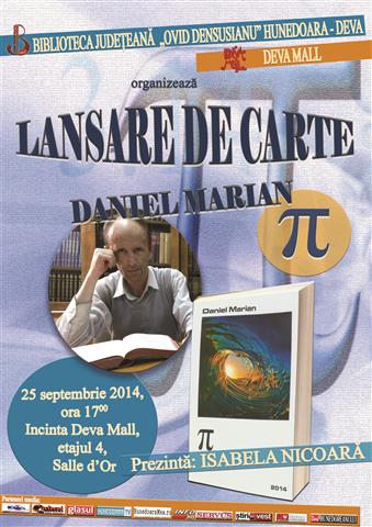 Biblioteca Judeteana „Ovid Densusianu” Hunedoara-Deva organizeaza in ziua de 25 septembrie 2014, ora 17.00, in incinta Deva Mall, etajul patru, Salle d’Or, lansarea noului volum de poezii al ziaristului si poetului Daniel MARIAN, volum intitulat „Pi”. Daniel Marian este un nume cunoscut in presa hunedoreana post-decembrista, articolele sale din „Actual”, „Oglinda”, „Lumina” fiind realizate cu probitate jurnalistica si obiectivitate. A colaborat si cu ziare centrale precum „Ziua”, „România Libera”, „Transilvania Jurnal”, „Jurnalul National”, „Evenimentul Zilei”. A mai semnat in revistele „Academia Catavencu”, „Saptamâna Integral HD”, „Lumea de azi” – Deva, „Revolutionarul” din Lugoj, „Pensionarul” si „Info Start” din Deva etc. Pasionat de literatura, a fost prezent cu versuri si cronici literare in publicatii de prestigiu ca „Tribuna”, „Vatra”, „Oglinda literara”, „Steaua”, „Orizont”, „SLAST”, „Ramuri”, „Ardealul literar si artistic”, „Opinii culturale”, „Noua Provincia Corvina”, „Constelatii Diamantine”, „ProSaeculum”, „Algoritm literar”, „Impact cultural”, „Daruiri literare”, „Citadela”, „Lumina Lina” (SUA ), „Observatorul” (Canada), „Onyx” (Irlanda), „Zemra Sqhiptare” (Albania) s.a. Pâna in prezent, i s-au publicat volumele de poezie Capita de fluturi, ingerii mei (2011), Penumbra penitei (2013) si cronicile literare adunate in volumul O biblioteca pentru balansoarul meu (2012, 2013). Prezentul volum imbogateste registrul liric al poetului Daniel Marian cu noi viziuni, de o mare originalitate, asupra lumii si asupra eternelor interogatii pe care poetul si le adreseaza siesi in legatura cu viata si moartea, iubirea si sensul existentei, trecerea prin lume. Cu prilejul acestei lansari, poetul Daniel Marian va oferi autografe iubitorilor de poezie.