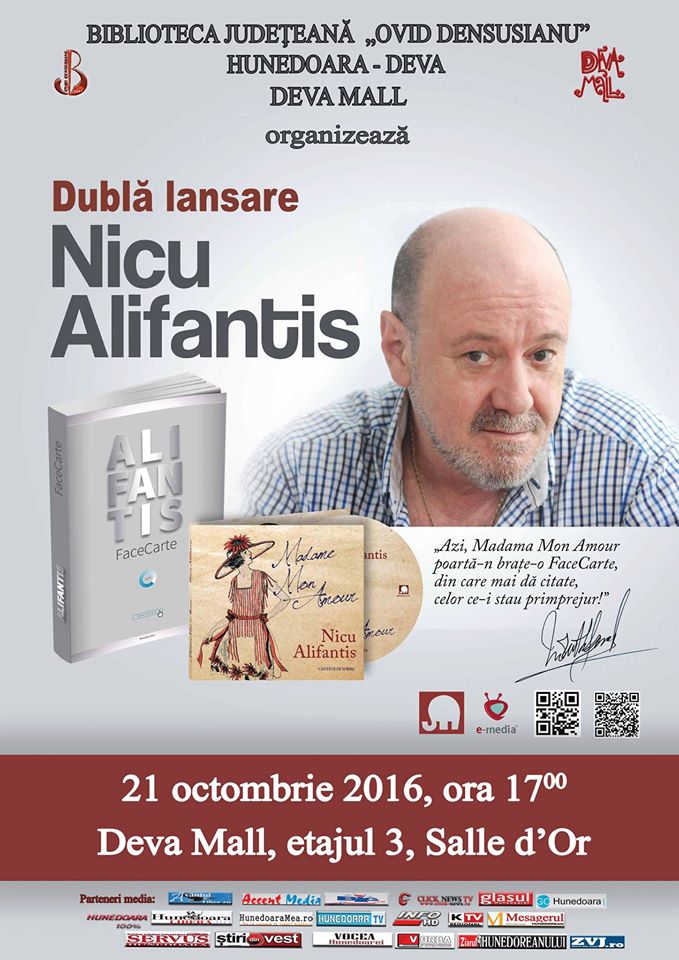 Biblioteca Județeană „Ovid Densusianu” Hunedoara-Deva organizează în ziua de 21 octombrie 2016, ora 1700, în incinta Deva Mall, etajul trei, Salle d’Or, un eveniment cultural excepțional: întâlnirea cu îndrăgitul artist Nicu Alifantis, care a răspuns invitației de a veni la Deva pentru lansarea celui mai recent CD al său, intitulat „Madame Mon Amour. Cântece de iubire”, și a volumului „FaceCarte”.