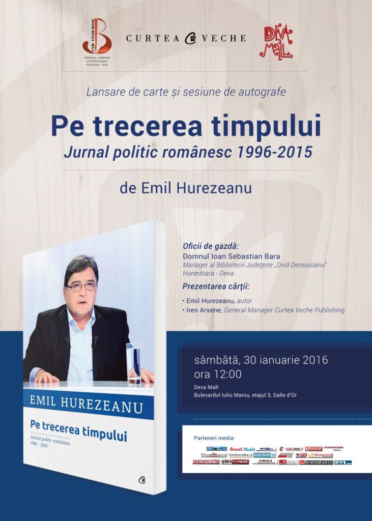 Biblioteca Judeteana „Ovid Densusianu” Hunedoara-Deva si Curtea Veche Publishing organizeaza in ziua de 30 ianuarie 2016, ora 12.00, in incinta Deva Mall, etajul trei, Salle d’Or, o intalnire cu scriitorul, publicistul si analistul politic Emil Hurezeanu care, cu acest prilej, isi va lansa volumul Pe trecerea timpului. Jurnal politic romanesc 1996-2015.