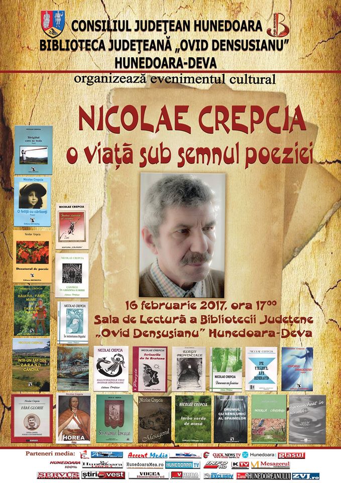 Biblioteca Județeană „Ovid Densusianu” Hunedoara-Deva organizează în ziua de 16 februarie 2017, ora 1700, la Sala de Lectură a Bibliotecii, un eveniment cultural dedicat poetului Nicolae Crepcia la împlinirea vârstei de 65 de ani. Cu acest prilej Biblioteca Județeană îi va dărui biobibliografia intitulată Nicolae Crepcia – o viață sub semnul poeziei.