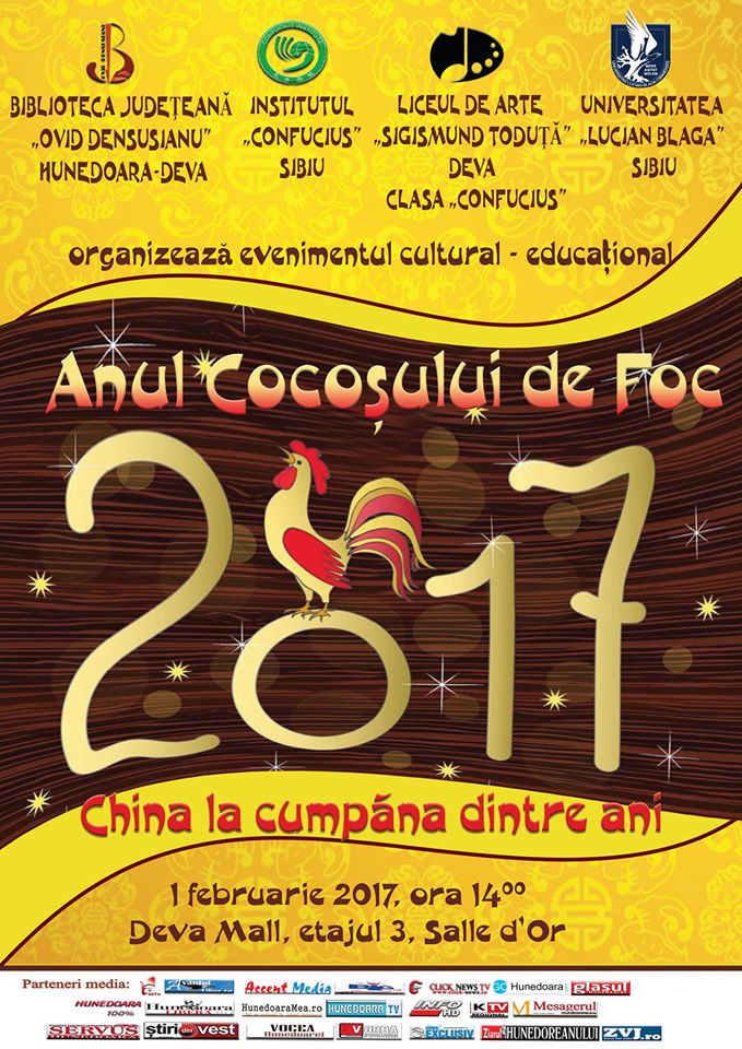 Anul acesta, la Deva, festivitățile dedicate Anului Nou Chinezesc vor avea loc la 1 februarie 2017, ora 14.00, la Deva Mall, etajul trei, Salle d’Or, și vor începe prin cuvinte de deschidere și de întâmpinare rostite de organizatori: Ioan Sebastian Bara, manager al Bibliotecii Județene „Ovid Densusianu” Hunedoara-Deva, prof. Gheorghe Ioan Mihuț, director al clasei „Confucius” de la Liceul de Arte „Sigismund Toduță” Deva, prof. univ. dr. ing. Constantin Oprean, președintele Institutului „Confucius” și prof. univ. dr. Song Shaofeng, directorul Institutului „Confucius” de pe lângă Universitatea „Lucian Blaga” din Sibiu.
