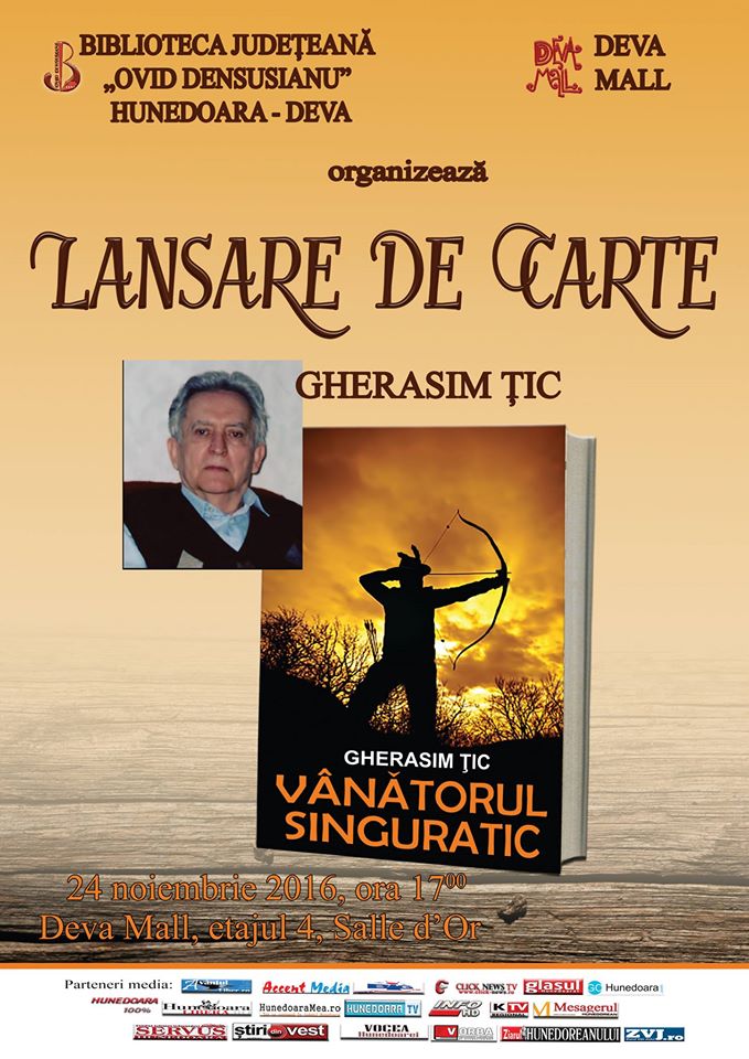 Biblioteca Județeană „Ovid Densusianu” Hunedoara-Deva invită iubitorii de literatură, în ziua de 24 noiembrie 2016, ora 1700, în incinta Deva Mall, etajul patru, Salle d’Or, la o întâlnire cu scriitorul Gherasim Țic, care își va lansa recentul volum intitulat Vânătorul singuratic, apărut la Editura Orizonturi din București.