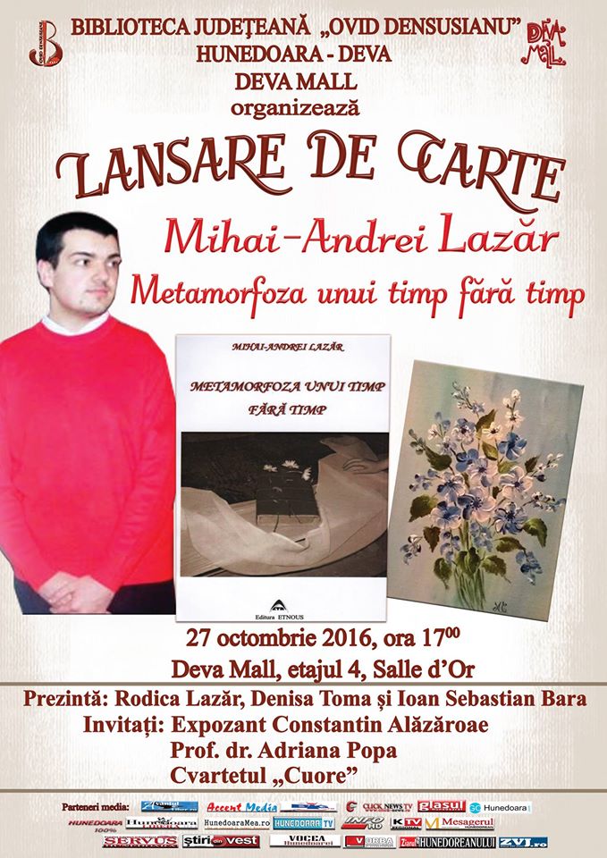 Biblioteca Județeană „Ovid Densusianu” Hunedoara-Deva își invită prietenii cititori la un eveniment cultural cu totul special, în ziua de 27 octombrie 2016, ora 17.00, în incinta Deva Mall, etajul patru, Salle d’Or: lansarea cărții „Metamorfoza unui timp fără timp”, semnată de Mihai-Andrei Lazăr, unul din cei mai tineri scriitori din județul Hunedoara. Autorul are 18 ani și este un strălucit elev al Colegiului Național „Iancu de Hunedoara”, în clasa a XI-a. Laureat al tuturor olimpiadelor județene de limba și literatura română la care a participat din clasa a V-a încoace, laureat al olimpiadelor și concursurilor naționale, Mihai-Andrei Lazăr este la al doilea volum, primul – „La limita dintre real și fabulos”, lansat în mai 2012, bucurându-se de aprecierea unanimă a cititorilor, a profesorilor de limba și literatura română.