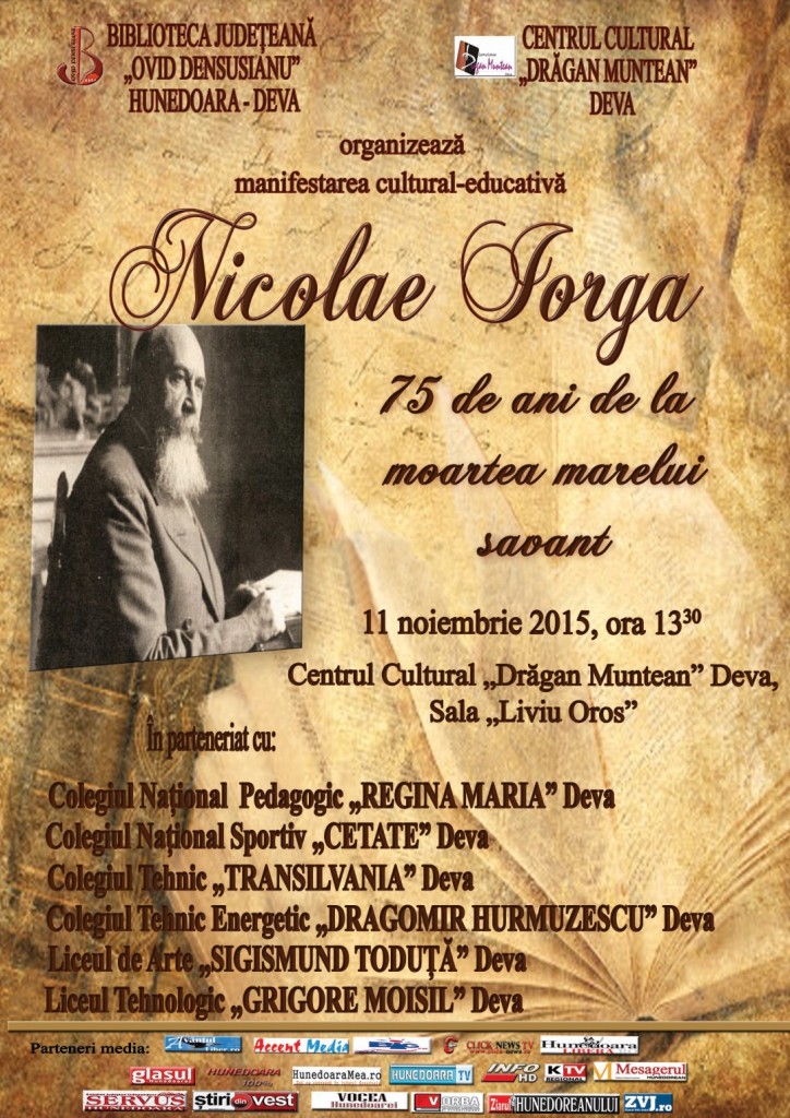 Biblioteca Judeteana „Ovid Densusianu” Hunedoara-Deva organizeaza in ziua de 11 noiembrie 2015, ora 13.30, in Sala „Liviu Oros” a Centrului Cultural „Dragan Muntean” din Deva, o manifestare cultural-educativa menita sa evoce personalitatea marelui istoric, om politic si de cultura Nicolae Iorga, de la a carui asasinare, la 27 noiembrie 1940, s-au implinit 75 de ani.