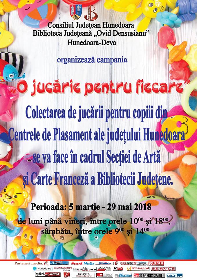 Toți cei care vor să le dăruiască acestor copii jucării sunt așteptați la Secția de Artă și Carte Franceză a Bibliotecii Județene „Ovid Densusianu” Hunedoara-Deva, cu sediul în municipiul Deva, str. 1 Decembrie 1918, nr. 26, unde se va afla un centru de colectare a jucăriilor, în perioada 5 martie – 29 mai 2018, de luni până vineri între orele 1000 și 1800, iar sâmbăta între orele 900 și 1400.