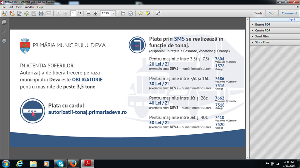 Primăria Municipiului Deva informează că începând de joi, 14 ianuarie 2016, toţi cei interesaţi pot achita contravaloarea autorizaţiei de liberă trecere prin municipiul Deva pentru maşinile de peste 3,5 tone cu ajutorul cardului bancar sau prin SMS.