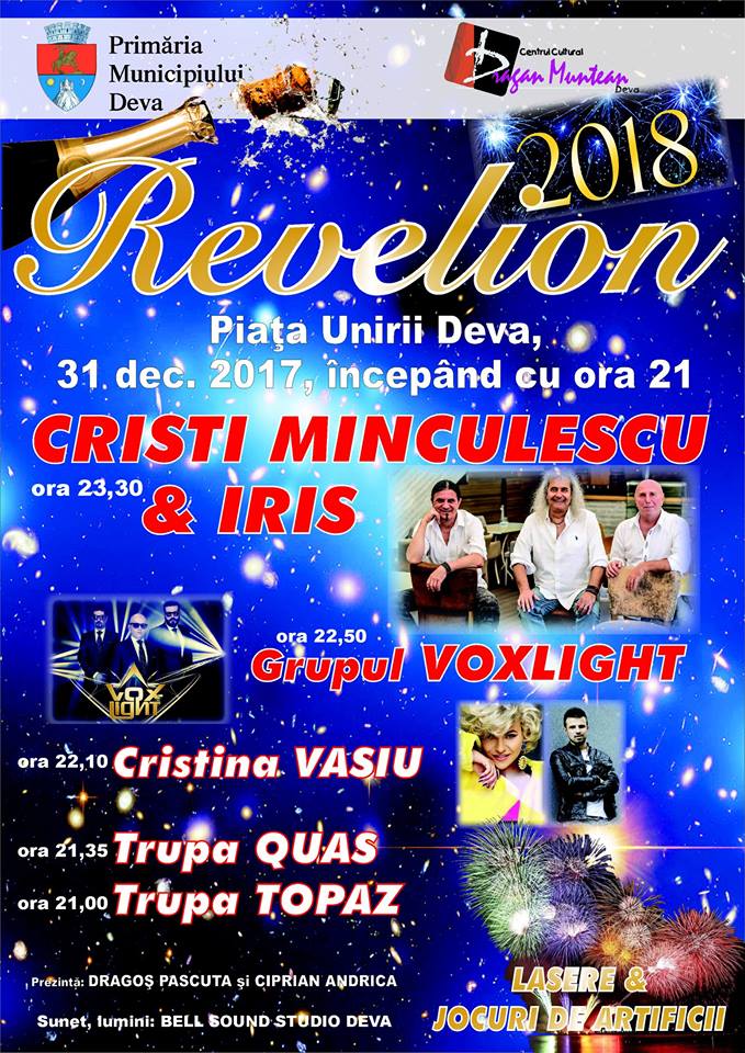 Vor cânta la Deva, în noaptea dintre ani, trupele Voxlight, Topaz și Quas, Cristi Minculescu & Iris și Cristina Vasiu.
