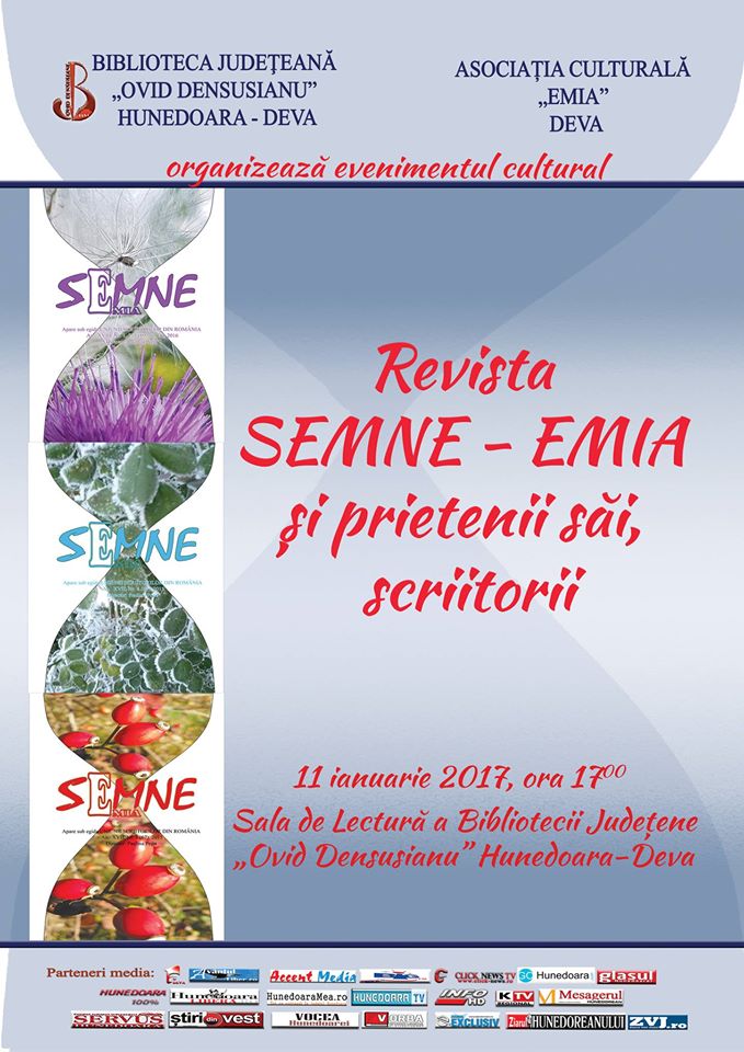 Biblioteca Județeană „Ovid Densusianu” Hunedoara-Deva împreună cu Asociația Culturală „Emia” Deva organizează în ziua de 11 ianuarie 2017, ora 17.00, la Sala de Lectură a Bibliotecii Județene „Ovid Densusianu” Hunedoara-Deva un eveniment cultural special.