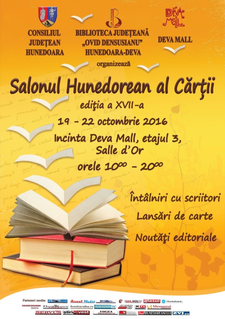 Biblioteca Judeteana „Ovid Densusianu” Hunedoara-Deva organizeaza, in perioada 19 – 22 octombrie 2016, cea de-a XVII-a editie a traditionalului Salon Hunedorean al Cartii. Timp de patru zile, intre orele 1000 si 2000, in eleganta Salle d’Or din incinta Deva Mall, etajul trei, vor fi gazduite standurile celor 111 edituri care au raspuns invitatiei de a veni la Deva cu oferta editoriala de ultima ora.
