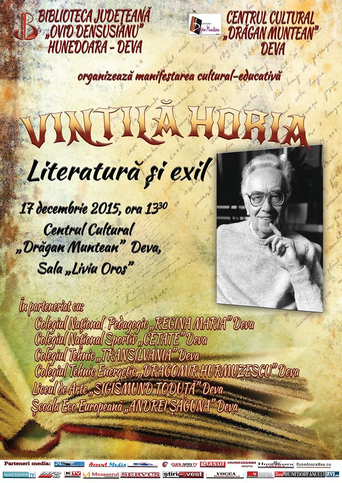Biblioteca Județeană „Ovid Densusianu” Hunedoara-Deva organizează în ziua de 17 decembrie 2015, ora 1330, la Sala „Liviu Oros” a Centrului Cultural „Drăgan Muntean” din Deva o manifestare cultural-educativă dedicată împlinirii a 100 de ani de la nașterea scriitorului Vintilă Horia. Sub genericul Vintilă Horia – Literatură și exil vor fi prezentate viața și creația acestui scriitor român, unul dintre marii reprezentanți ai exilului românesc.