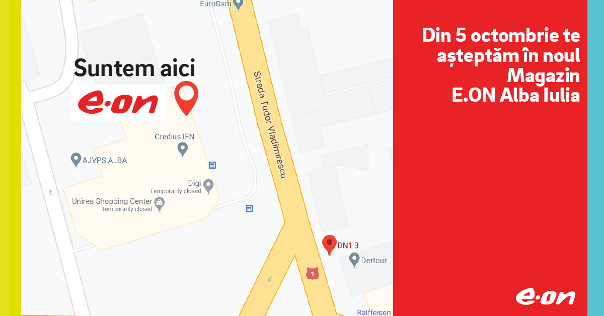 Magazinul este ușor de accesat din orice punct al orașului;Centrul municipiului Alba Iulia va găzdui începând de luni, 5 octombrie, noua locație a Magazinului E.ON, situat pe str.Tudor Vladimirescu nr. 3. Programul de funcționare este între orele 08.00 și 16.00 pentru zilele de luni, marți, miercuri și vineri, respectiv între orele 10.00 și 18.00, pentru ziua de joi. „Suntem foarte bucuroși că reușim să le oferim clienților un magazin spațios, confortabil, aflat într-o zonă frumoasă, intens circulată și ușor de accesat din toate punctele orașului. Avem convingerea că serviciile noastre, atât cele din magazine, cât și cele din online – care devin tot mai utilizate- vor fi tot mai apreciate de clienții noștri”, declară Claudia Griech, Directorul general adjunct al E.ON Energie România.La fel ca și în magazinele E.ON unde pot contracta/obține informații despre serviciile și produsele E.ON, clienții pot opta pentru canale moderne și rapide de comunicare puse la dispoziție de companie. Canalele pot fi accesate: