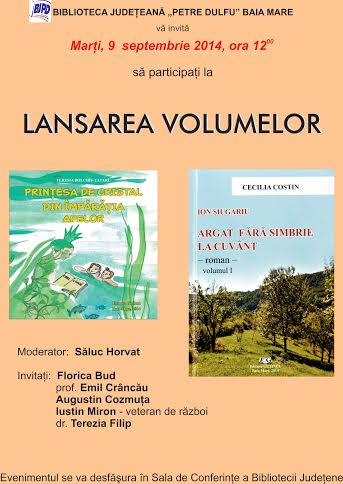 Marți, 9 septembrie la ora 12, în Sala de Conferințe, va avea loc lansarea volumelor „Ion Șiugariu, argat fără simbrie la cuvânt” și „Prințesa de cristal din împărăția apelor”, apărute la Baia Mare, Editura Gutinul, 2014, semnate de Teresia Bolchiș-Tătaru, prima sub pseudonimul Cecilia Costin.