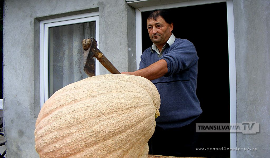 Pentru a fi mişcat din loc, a fost nevoie de trei oameni. Prima dată mutarea a fost făcută la proba cântarului, unde acul s-a oprit la 61 de kilograme. A doua mutare, ceva mai lungă, a fost din grădină, în faţa casei unde a fost tăiat şi porţionat pentru pus la foc. Crăpat în două cu securea, o jumătate de dovleac va fi consumat fiert, iar cealaltă prăjit la cuptor. Din prima socoteală, au ieşit lejer 400 de porţii, din care se poate sătura tot satul.