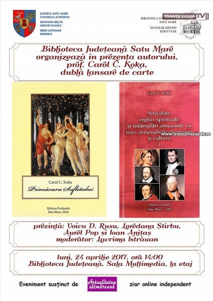 Biblioteca Județeană Satu Mare, instituție publică de cultură subordonată Consiliului Județean Satu Mare, va găzdui luni, 24 aprilie 2017, cu începere de la ora 14.00, în Sala Multimedia, un dublu eveniment editorial.