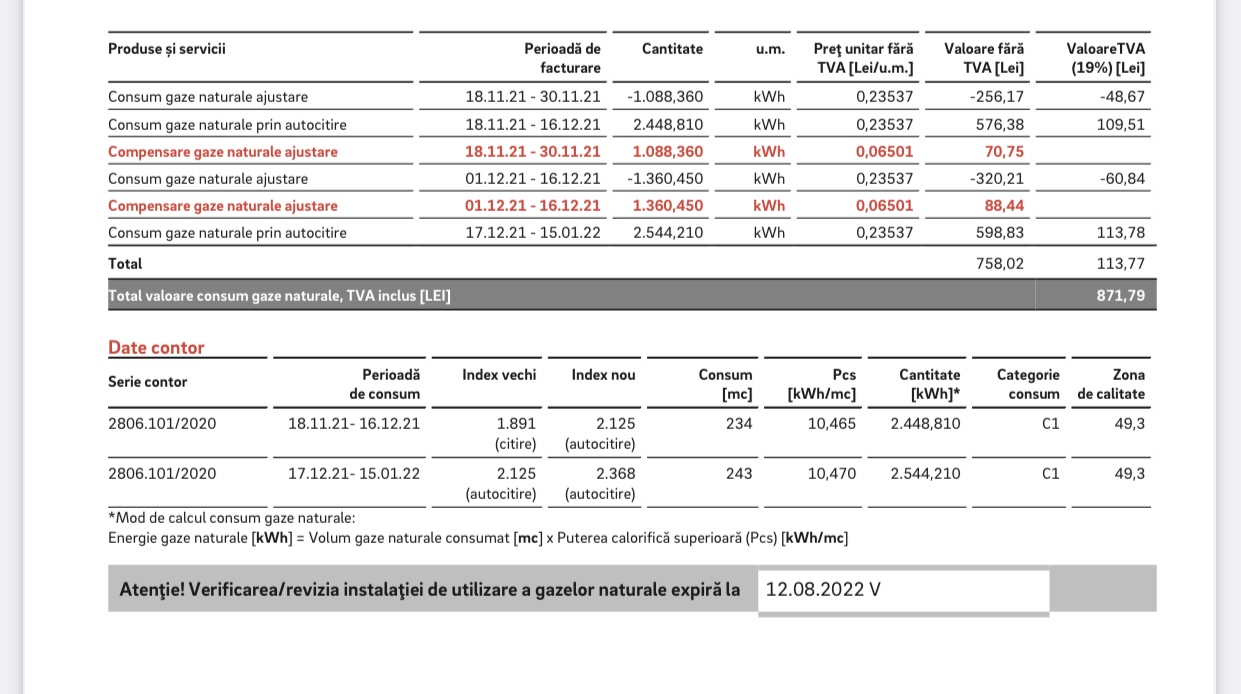 Am primit factura seria MS EON NR 1022564897/28.01.2022 de la E.ON STANDARD GAS. Potrivit acesteia (vezi foto) eu trebuie sa platesc suma de 871,79 lei. Am incercat sa aflu cum s-au facut calculele, in conditiile in care eu nu am nicio restanta si consumul de gaze este aproape la fel, cu cel de luna trecuta, cand am platit 526,70 lei. Nu inteleg de ce s-a revenit la lunile noiembrie si decembrie, pe care eu le-am achitat si nu inteleg de ce a crescut suma de plata, mai ales ca am primit si compensare de 159,19 lei ( 70,75 lei plus 88,44 lei). Din calculele mele rezulta ca eu trebuie sa platesc si compensarea de 159,19 lei. Am sesizat E.ON si OPC Alba. Sper sa se clarifice situatia.