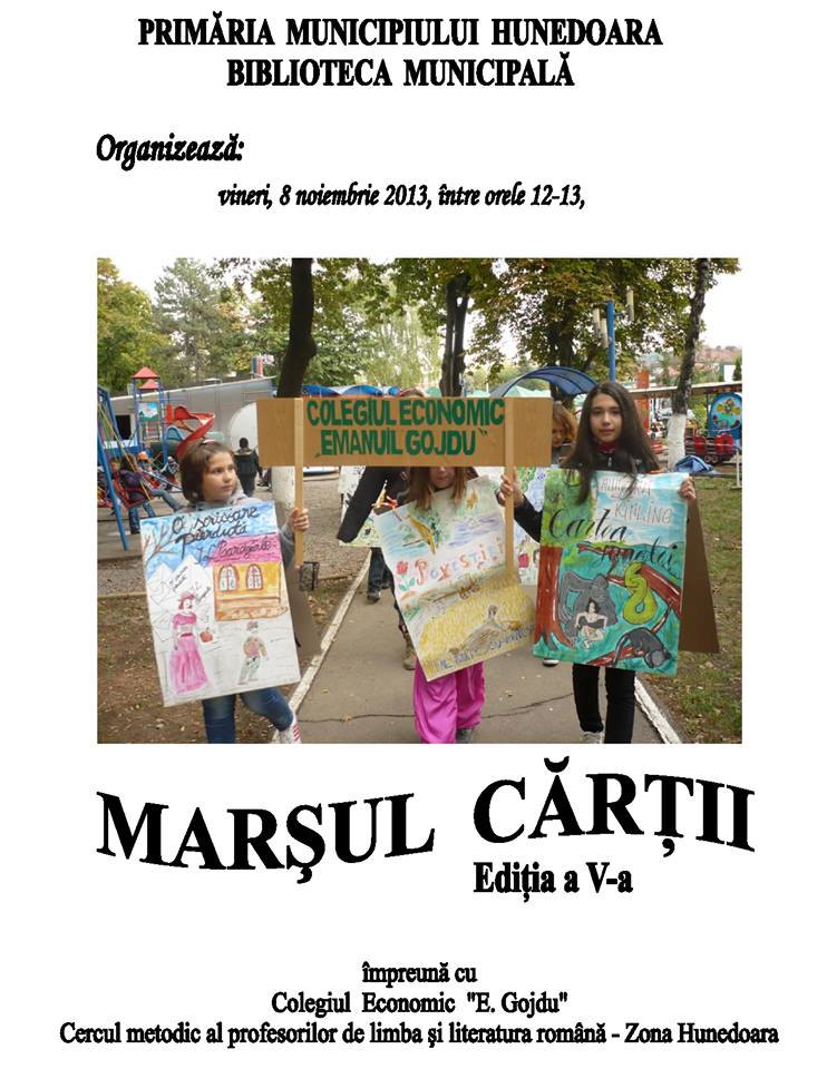 Acţiunea, organizată de Primăria municipiului Hunedoara şi Biblioteca Municipală împreună cu Colegiul Economic „Emanuil Gojdu” şi cercul metodic al profesorilor de limba şi literatura română, zona Hunedoara, poartă numele de „Marşul cărţii”, se află la a cincea ediţie şi are acelaşi scop – incitarea la lectură.