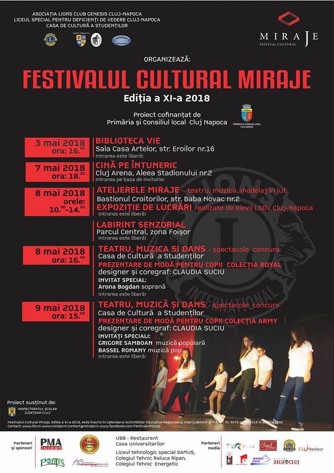 Liceul Special pentru Deficienți de Vedere Cluj-Napoca, instituție de învățământ special subordonată Consiliului Județean Cluj, în colaborare cu Asociația Lions Club Genesis, Cluj – Napoca, organizează în perioada 3-9 mai 2018, cea de a XI – a ediție a Festivalului Cultural Miraje – Arta nu are limite!
