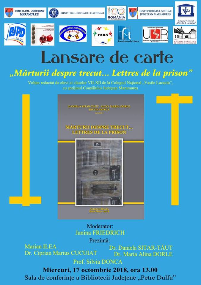 Miercuri, 17 octombrie, ora 13, la Biblioteca Judeâeană Baia Mare va avea loc lansarea volumului „Mărturii despre trecut… Lettres de la prison”, redactat de elevi din clasele VII-XII de la Colegiul Naţional „Vasile Lucaciu”, coordonatori: Daniela Sitar-Tăut, Alina Maria Dorle, Silvia Donca, publicat la Editura Acteon Books, Baia Mare, 2018.