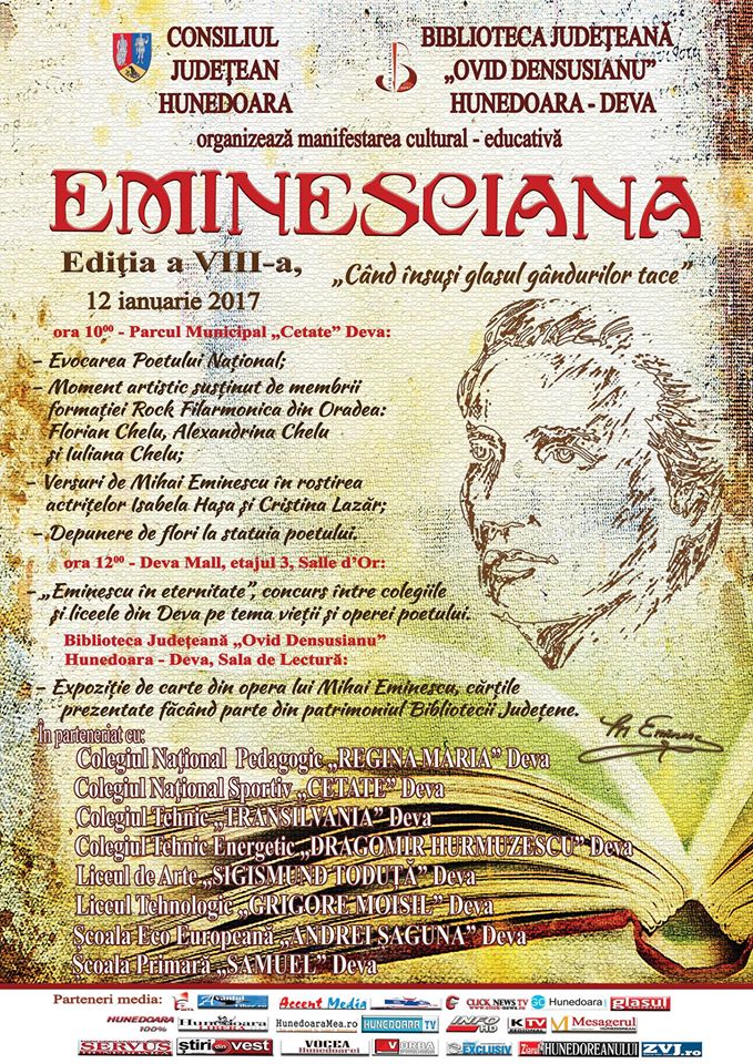 Biblioteca Județeană „Ovid Densusianu” Hunedoara-Deva organizează și în acest an, cu prilejul Zilei Culturii Naționale, ziua de naștere a marelui nostru poet Mihai Eminescu, o manifestare culturală specială desfășurată sub semnul prețuirii creației sale, în ziua de 12 ianuarie 2017, la locul tradițional de omagiere a marelui poet, la statuia acestuia din Parcul Cetății.