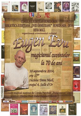 Biblioteca Judeteana „Ovid Densusianu” Hunedoara-Deva organizeaza in ziua de 10 septembrie 2014, ora 17.00, in incinta Deva Mall, etajul patru, Salle d’Or, un eveniment cultural deosebit. Va fi sarbatorit poetul, eseistul, jurnalistul, omul de cultura Eugen EVU, in ziua in care implineste 70 de ani. Este un moment special dedicat unei personalitati de exceptie a culturii hunedorene. Manifestarea se va desfasura sub genericul „Eugen Evu, magicianul cuvintelor la 70 de ani”, cu acest prilej Biblioteca Judeteana daruindu-i o ampla biobibliografie.