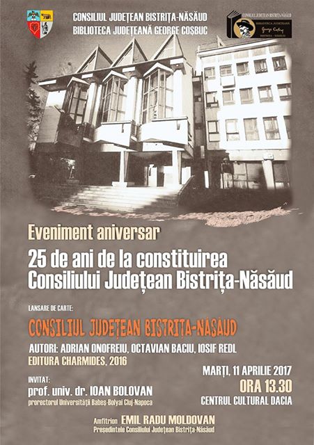 Consiliul Județean Bistrița-Năsăud și Biblioteca Județeană „George Coșbuc” Bistrița-Năsăud organizează marți, 11 aprili, ora 13:30, la Centrul Cultural Daci, eveniment aniversar: 25 de ani de la constituirea Consiliului Județean Bistrița-Năsăud.