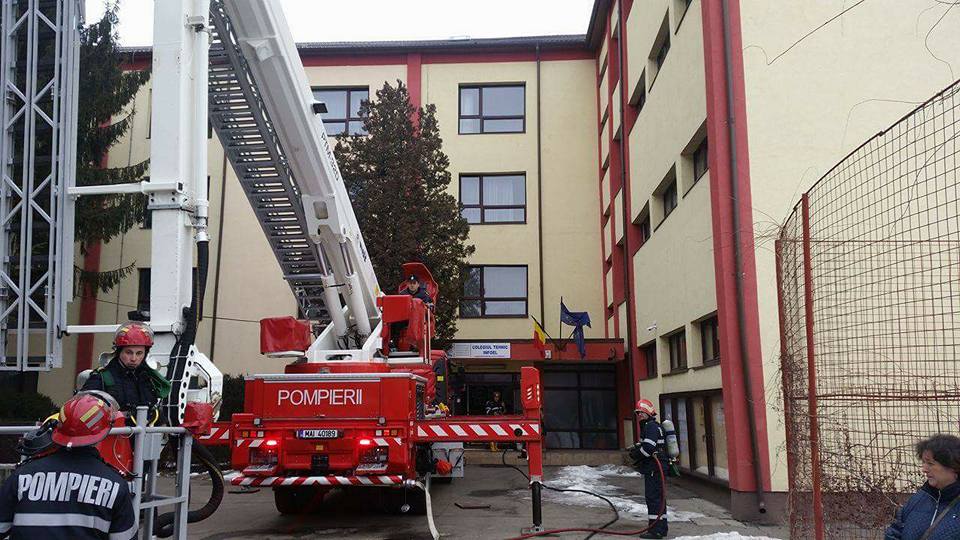Echipaje specializate din cadrul Detașamentului de Pompieri Bistrița, constituite în echipe de stingere și căutare – salvare, au acționat pentru localizarea și lichidarea unui incendiu izbucnit în Pavilionul A, etajul 3 – laboratorul de informatică și evacuarea a trei elevi, care nu puteau părăsi incinta clasei, conform scenariului.
