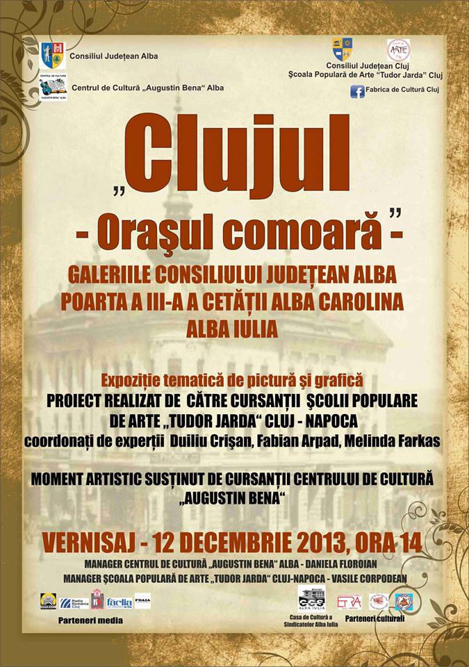 Şcoala Populară de Arte „Tudor Jarda” Cluj-Napoca, instituţie subordonată Consiliului Judeţean Cluj, în colaborare cu Consiliul Judeţean Alba, Centrul de Cultură „Augustin Bena” Alba Iulia şi Şcoala de Arte şi Mestesuguri, organizează la Alba Iulia vernisajul expoziţiei “Clujul – oraş comoară”. Știriul va avea loc în data de 12 decembrie 2013, de la ora 14:00, la Casa de Cultură a Sindicatelor din oraş. Expoziţia cuprinde 35 de lucrări de pictură şi grafică, realizate de cursanţii Şcolii Populare de Arte „Tudor Jarda” Cluj, de la clasele coordonate de experţii Călina Langa, Melinda Farkas, Duiliu Crişan şi Fabian Arpad. Iubitorii de frumos din Alba Iulia vor putea admira peisaje din judeţul Cluj, dar şi clădiri reprezentative ale oraşului de pe Someş printre care: Cazinoul, Casa lui Matei Corvin, Catedrala Ortodoxă, Teatrul Naţional şi Muzeul de Artă. În cadrul manifestării, cei prezenţi se vor putea bucura şi de un moment artistic susţinut de cursanţii Centrului de Cultură “Augustin Bena” Alba Iulia. Expoziţia „Clujul – oraş comoară” va fi deschisă publicului din Alba Iulia până la mijlocul lunii ianuarie 2014.