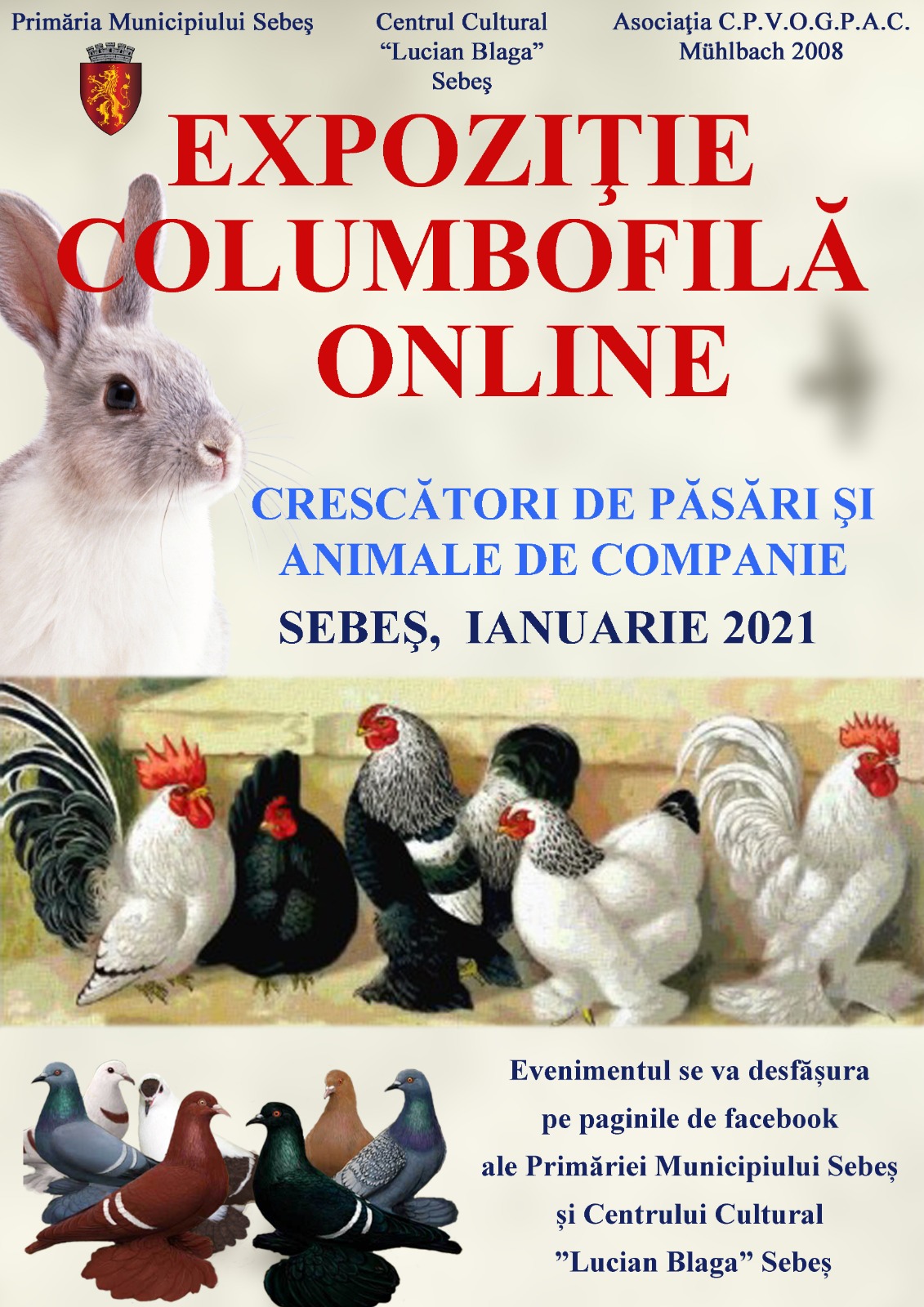 La finele lunii ianuarie, la Sebeș, era nelipsită expoziția columbofilă, organizată de autoritățile locale în parteneriat cu Asociaţia crescătorilor de porumbei voiajori, de ornament, păsări şi animale de companie „Mühlbach 2008”. Organizarea celei de-a XIV-a ediții a acestui eveniment, în mediul online (datorită pandemiei cu noul coronavirus), se dorește a fi și un gest de recunoaștere și de apreciere pentru crescătorii de păsări și animale de companie din Sebeș, proprietari ai unor exemplare rare, care au cules aprecieri și premii la expozițiile de profil.Pe paginile de facebook ale Primăriei Municipiului Sebeș și Centrului Cultural ”Lucian Blaga” Sebeș vor fi postate sâmbătă, 30 ianuarie 2021, începând cu ora 10.00, fotografiile trimise de cei 42 de membrii ai Asociaţiei crescătorilor de porumbei voiajori, de ornament, păsări şi animale de companie „Mühlbach 2008”. Aceștia au surprins în imagini viața de zi cu zi a exemplarelor pe care le cresc și le îngrijesc, împărtășind publicului larg culisele vieții de crescător pasionat, precum și satisfacția unică oferită de afecțiunea prietenilor necuvântători.