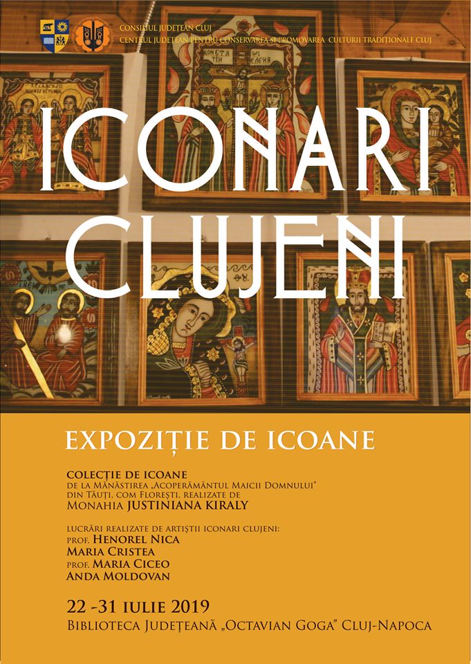 Centrul Județean pentru Conservarea și Promovarea Culturii Tradiționale Cluj, instituție de cultură care funcționează în subordinea Consiliului Județean, organizează în perioada 22 – 31 iulie 2019 expoziția „Iconari clujeni”. Astfel, în foaierul Bibliotecii Județene „Octavian Goga” din Cluj-Napoca pot fi admirate mai multe icoane realizate pe suporturi și în tehnici diferite, precum pictură pe sticlă și lemn, inspirate din izvoarele vechi, tradiționale.