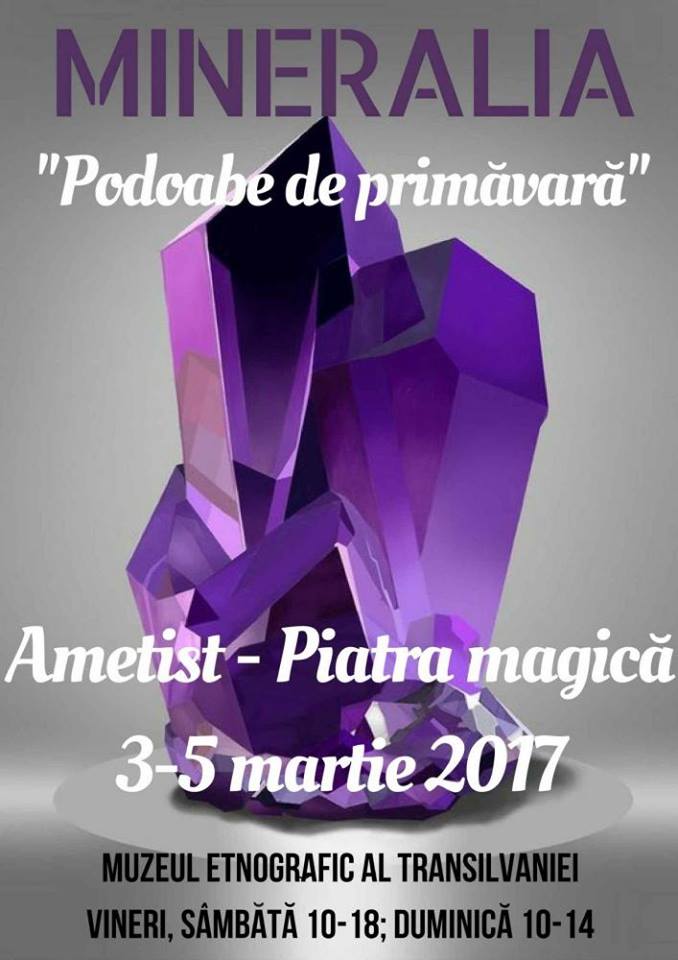 Muzeul Etnografic al Transilvaniei, instituție de cultură aflată sub autoritatea Consiliului Județean Cluj, invită publicul interesat la expoziția Mineralia: Ametistul – Piatra magică. Știriul va avea loc în perioada 3-5 martie 2017, în Sala Reduta (sediul instituției, str. Memorandumului nr. 21), iar expoziția poate fi vizitată conform următorului program: vineri și sâmbătă între orele 10:00-18;00, iar duminică de la ora 10:00 la ora 14:00.