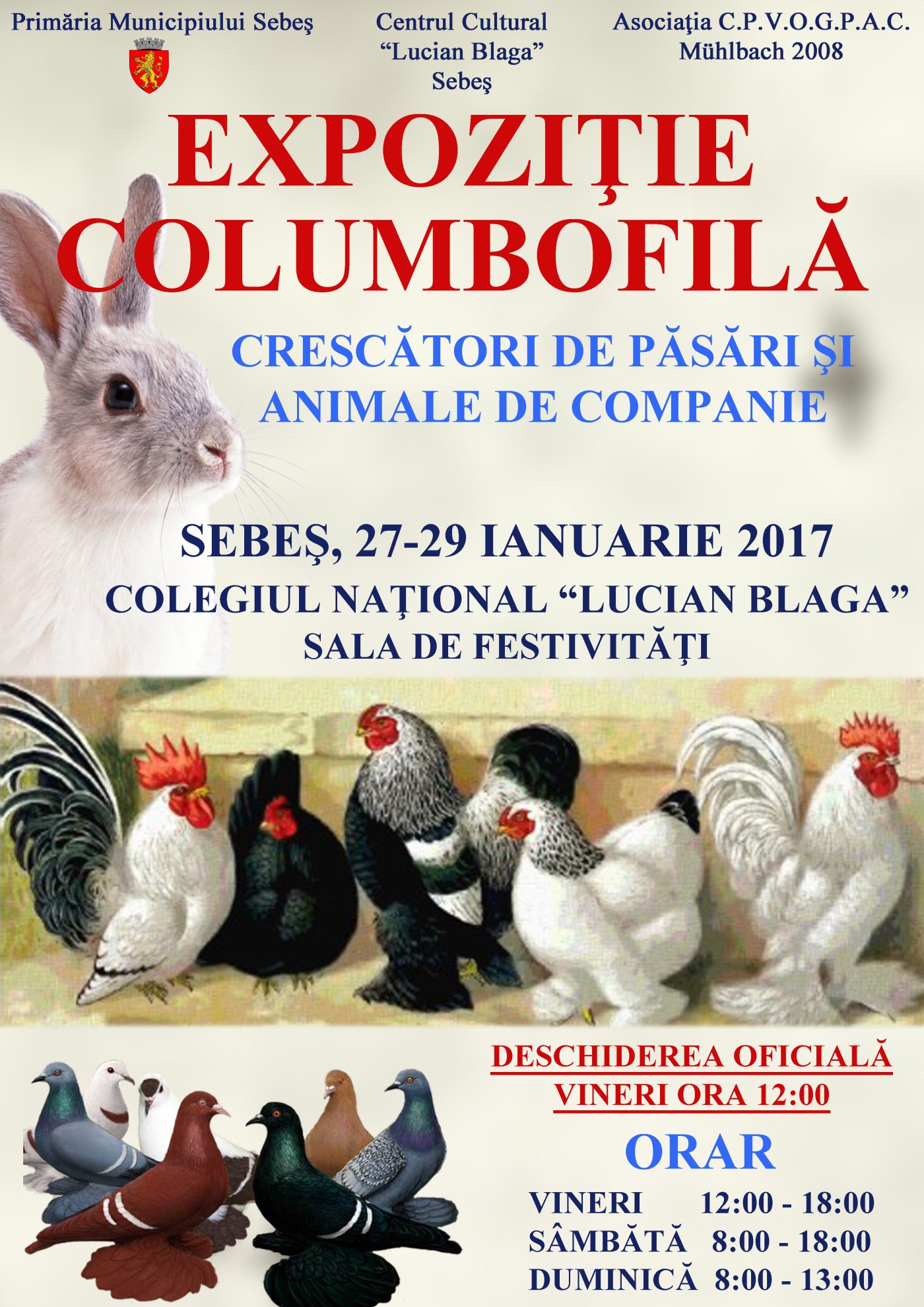27-29 ianuarie 2017Locaţie: Colegiul Naţional „Lucian Blaga”, sala de festivităţiPrimăria Municipiului Sebeş, în parteneriat cu Centrul Cultural „Lucian Blaga” şi cu Asociaţia crescătorilor de porumbei voiajori, de ornament, păsări şi animale de companie „Mühlbach 2008” organizează, în perioada 27 – 29 ianuarie 2017, o nouă ediţie a „Expoziţiei Columbofile”. Deschiderea acestei expoziţii va avea loc vineri, 27 ianuarie, la ora 12.00, locaţia fiind sala de festivităţi a Colegiului Naţional “Lucian Blaga” Sebeş.Evenimentul se va încheia, duminică, 29 ianuarie, la ora 13.00. Orarul expoziţiei este următorul:Vineri: ora 12.00 – ora 18.00Sâmbătă: ora 8.00 – ora 18.00Duminică: ora 8.00 – ora 13.00Intrarea este liberă.Şi-au anunţat participarea peste 70 de crescători.