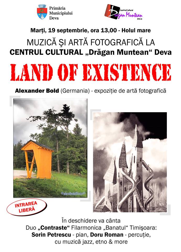 Primăria Municipiului Deva și Centrul Cultural ”Drăgan Muntean” Deva vă invită, marți, 19 septembrie 2017, la ora 13.00, la expoziția de artă fotografică ”Land of Existence”, semnată de artistul Alexander Bold (Germania), care va avea loc în holul mare al Centrului Cultural ”Drăgan Muntean”.