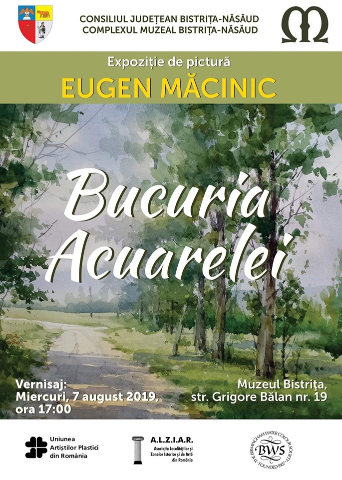 Complexul Muzeal Bistriţa-Năsăud organizează miercuri, 7 august, de la ora 17, la Muzeul Bistrița, str. Gen. Grigore Bălan, nr. 19, vernisajul expoziției de pictură „Bucuria Acuarelei”, semnată Eugen Măcinic.